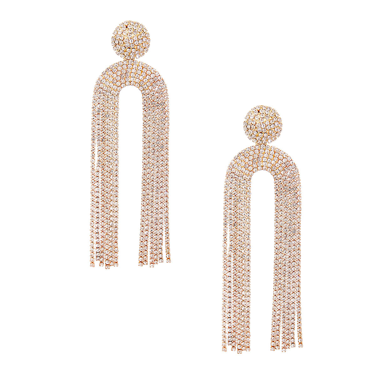 Gold Metal and Clear Crystal Rhinestone Long Arch Fringe Drop Earrings. Earrings measure 1.45 inches wide