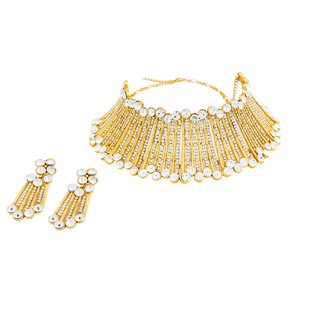 Gold Bar and Round Rhinestone Rigid Collar Choker Necklace Set
