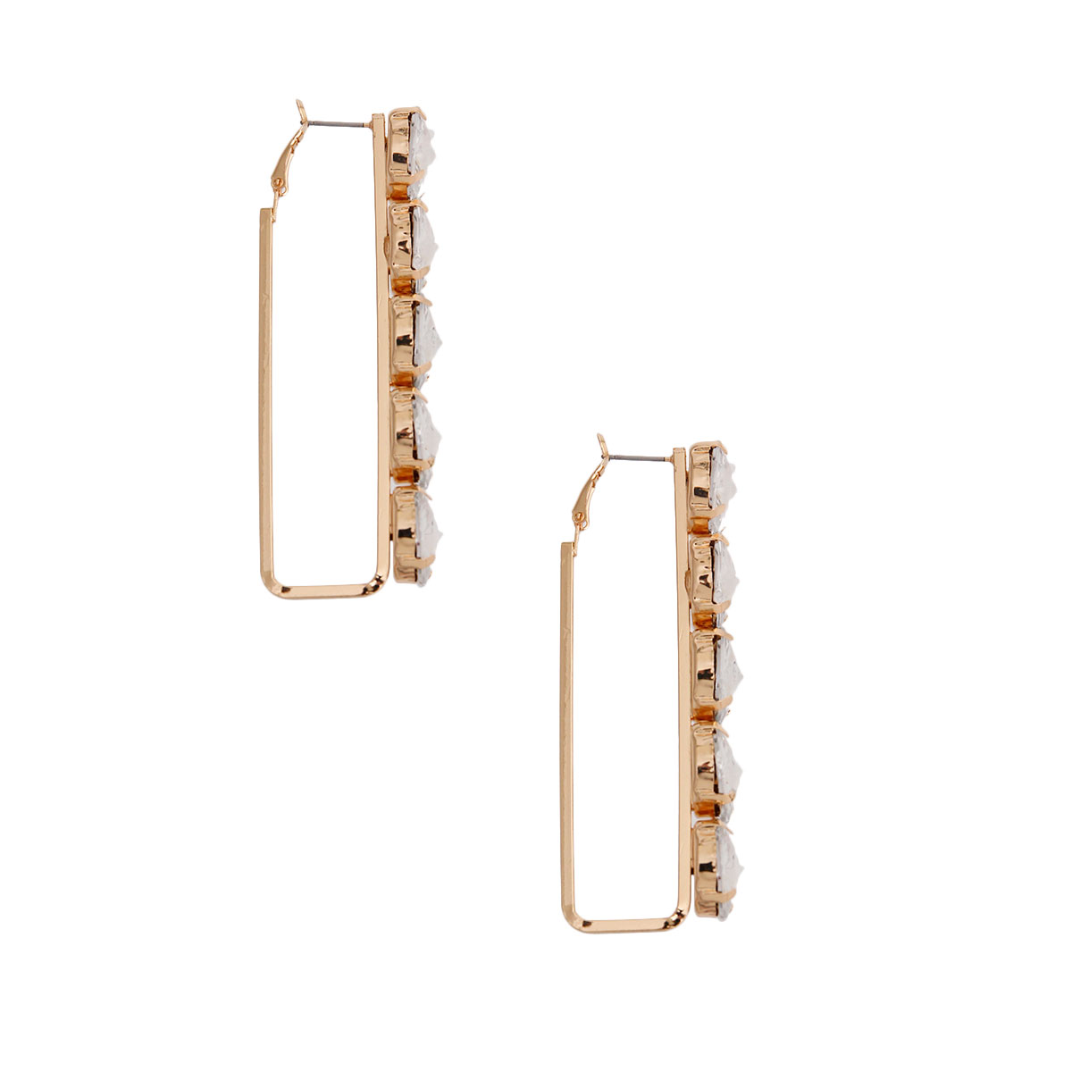 Gold Metal Bar Long Recetangle Hoop Earrings Featuring Chunky Clear Crystal Detailing. Earrings measure .8 inches wide