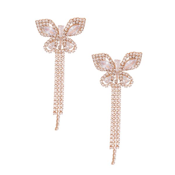 Gold Metal Butterfly Stud Earrings Featuring Rhinestone and Drop Fringe Detailing. Earrings measure 1.25 inches wide