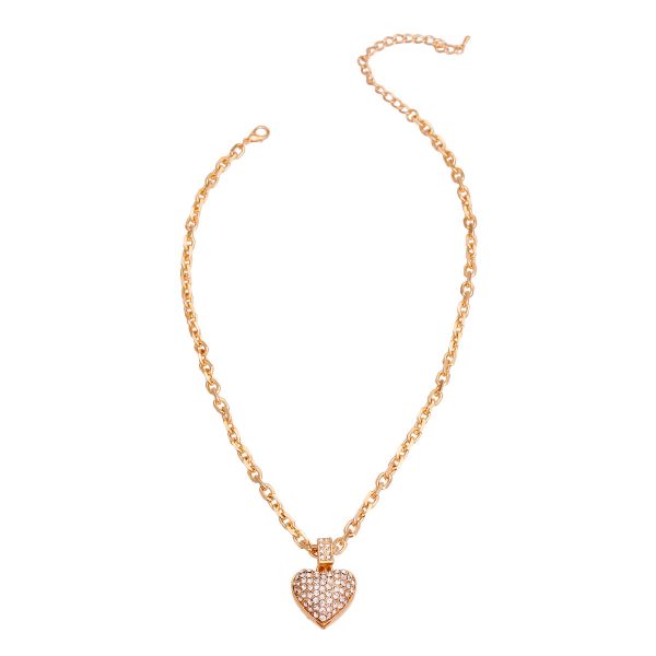 Gold Metal Oval Chain Necklace Featuring 3D Heart Pendant with Clear Rhinestone Detailing. Pendant measures 1.25 inches