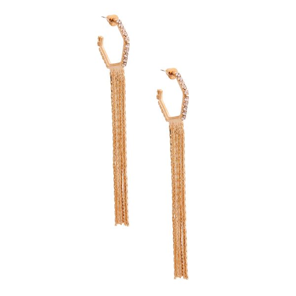 Gold Rhinestone Baby Hoop Earrings Featuring Metal Chain Fringe Detail. Earrings measure 1 inch wide