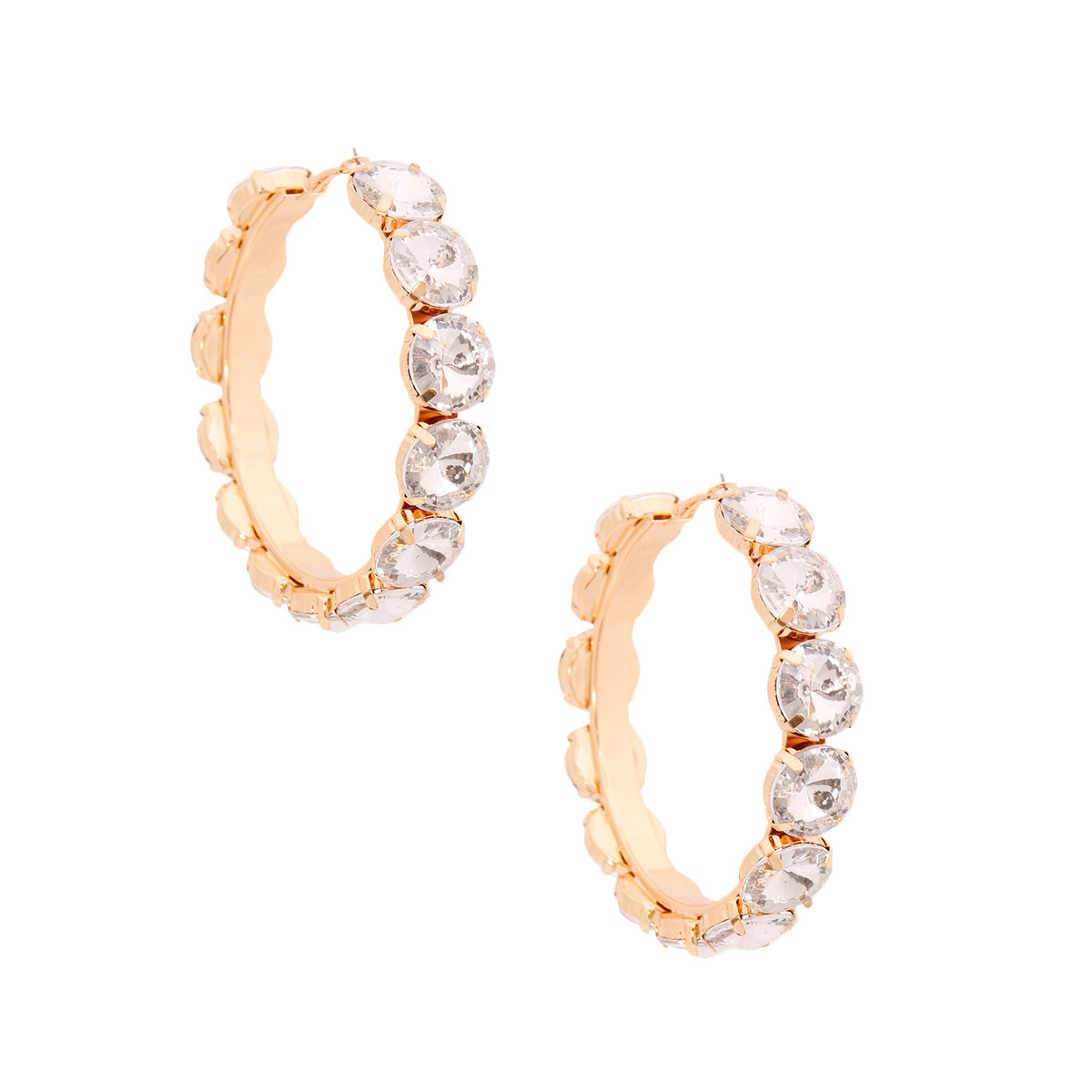Gold Metal Hoop Earrings Featuring Chunky Clear Round Crystal Detailing