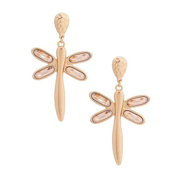Gold Matte Metal Drop Dragonfly Earrings Featuring Topaz Crystal Wings. Earrings measure 1.5 inches wide
