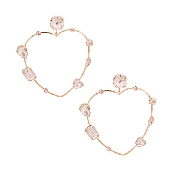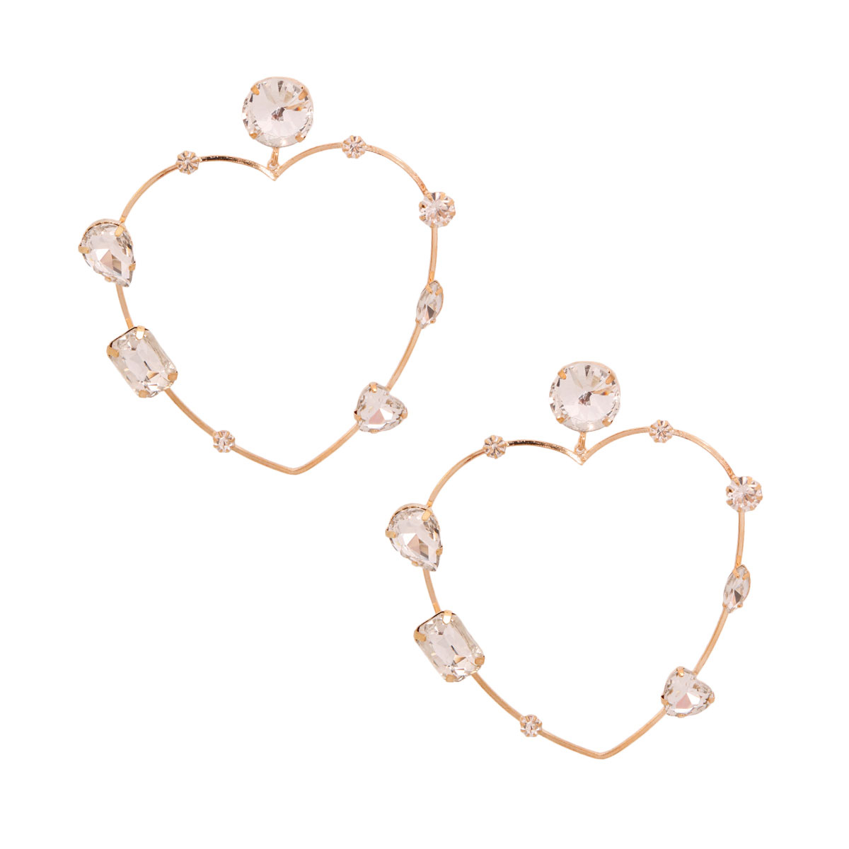 Gold Metal and Clear Crystal Heart Drop Earrings Featuring Various Crystal Shapes. Earrings measure 3 inches wide