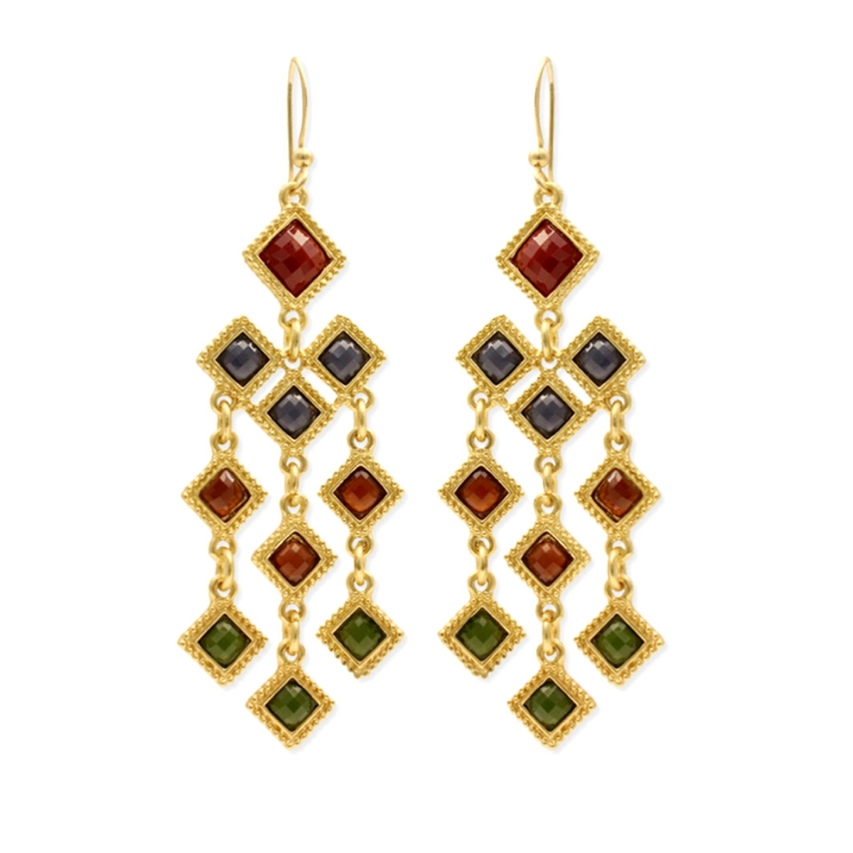 Gold Metal Diamond Shaped Drop Earrings Featuring Multi Color Resin Detailing