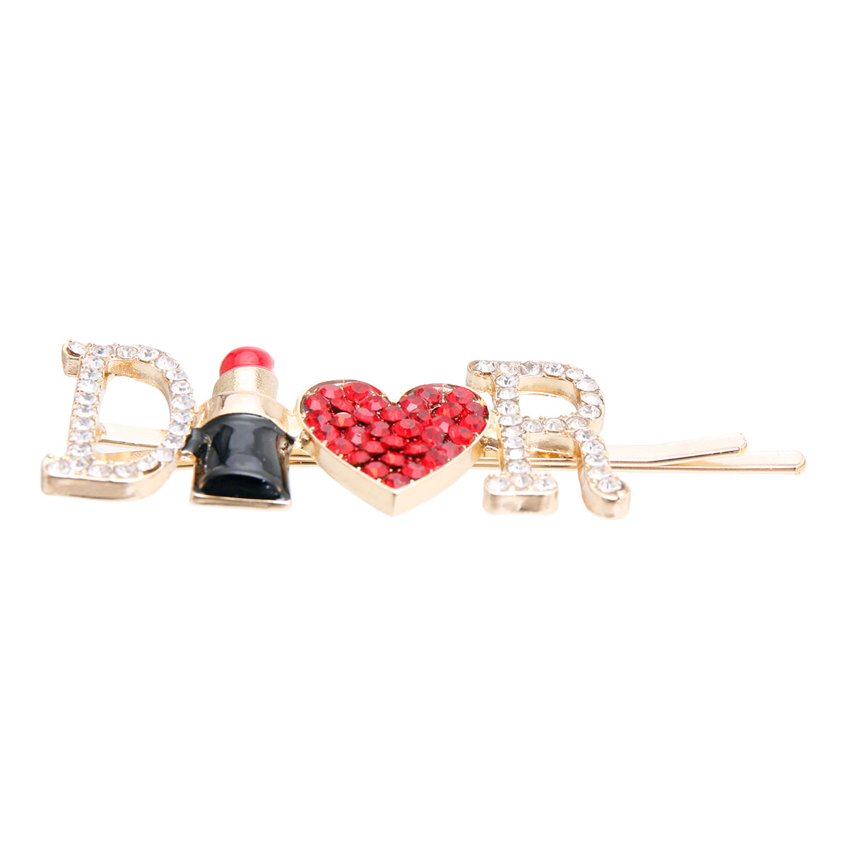 Dior Inspired Gold Metal Hair Bobby Pin Barrette Featuring DIOR with Crystal Rhinestones and Lipstick Detailing. Lettering measures 1 inch tall