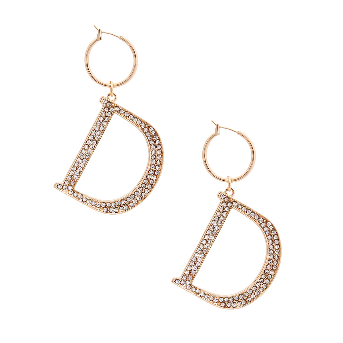 Gold Metal Baby Hoop Earrings Featuring Dior Style Rhinestone D Charm Detail. D measures 1.75 inches