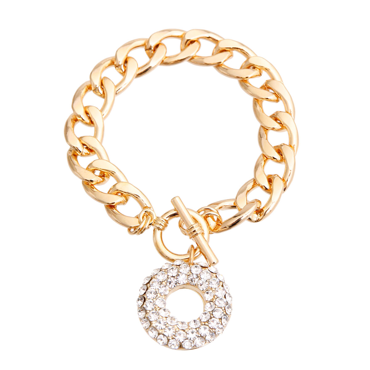 Gold Metal Chain Toggle Bracelet Featuring Rhinestone Donut Charm. Charm measures 1 inch