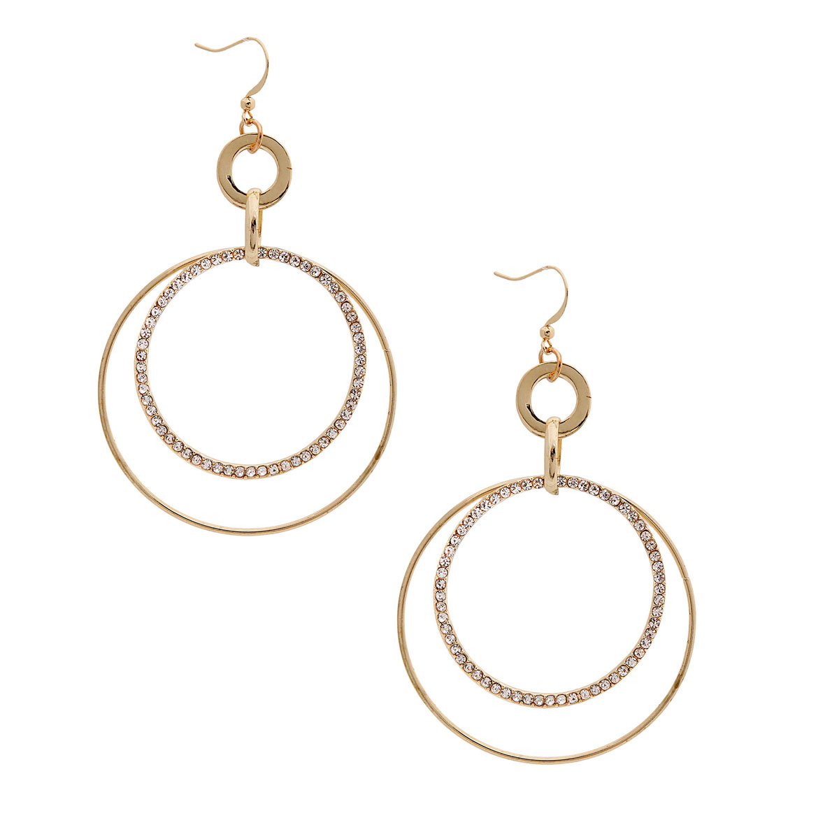 Gold Metal Double Circle Drop Earrings Featuring Rhinestone Detailing. Earrings measure 2.25 inches wide