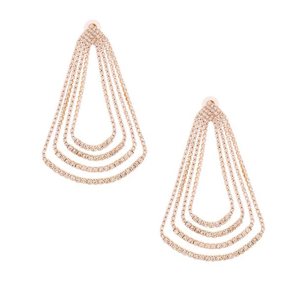 Gold Metal and Clear Crystal Rhinestone Graduated Concentric Teardrop Earrings. Earrings measure 2.5 inches wide