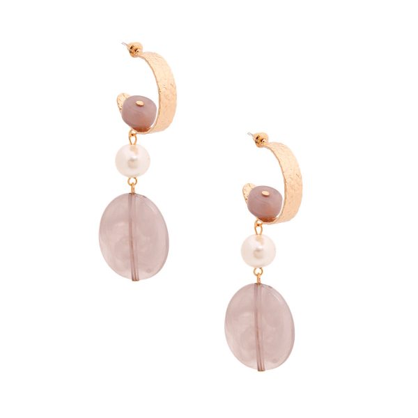 Gold Metal Hammered Hoop Earrings Featuring Gray Bead, Pearl and Swirled Gray Resin Drop Detail. Earrings measure 1.25 inches wide