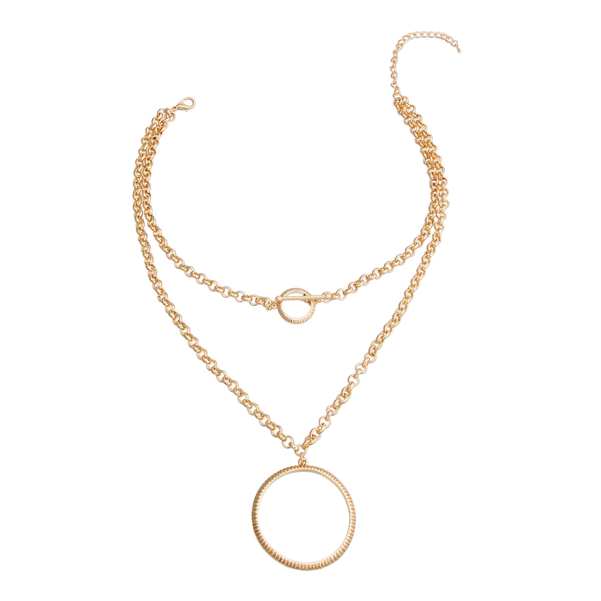 Gold Metal Double Layer Chain Featuring Circle Toggle Layer and Long Circle Pendant Layer. Circle Pendant measures 1.65 inches