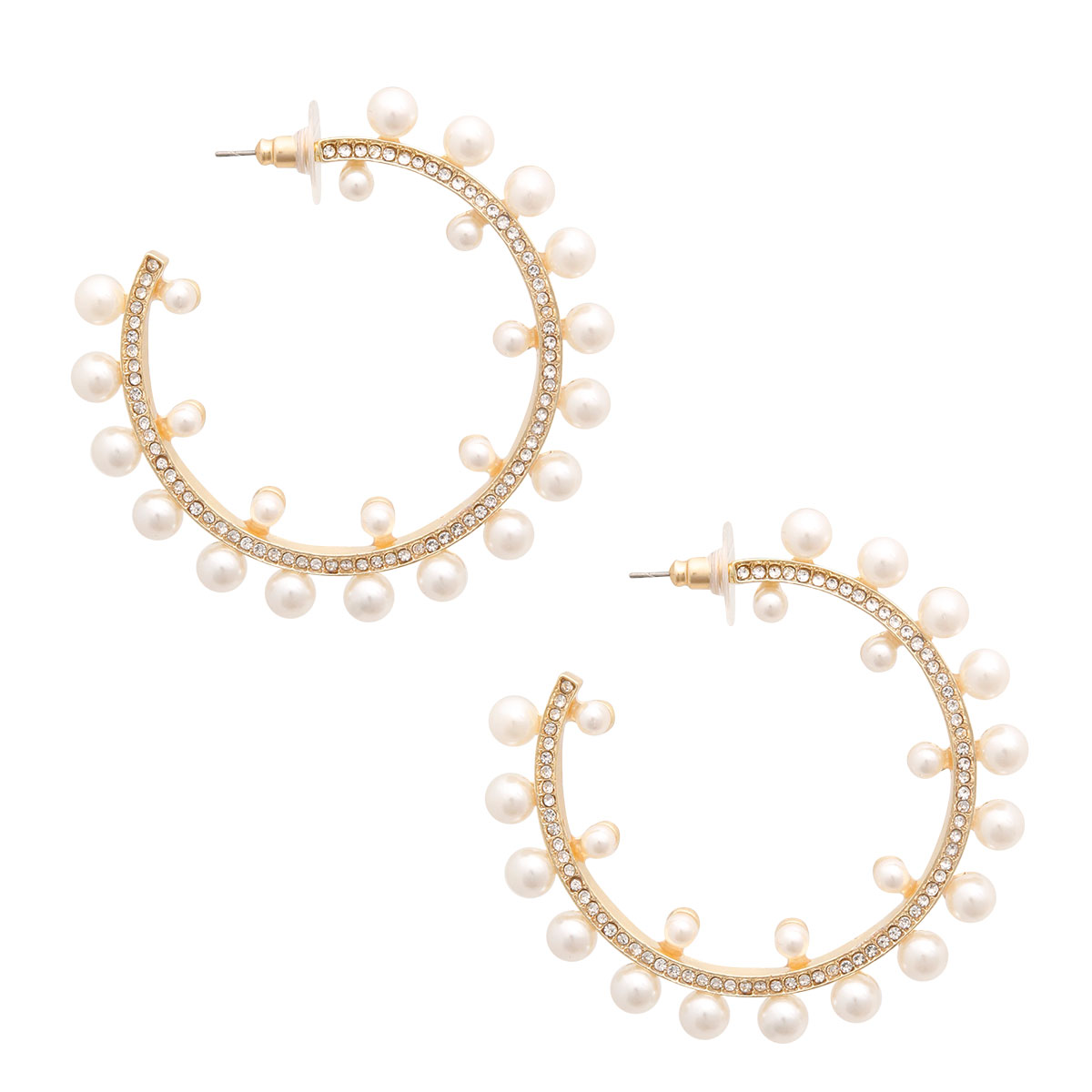 Gold Metal and Rhinestone Hoop Earrings Featuring Cream Pearl Edge Detailing