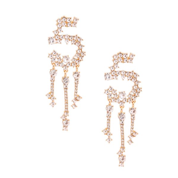 Designer Inspired High Quality Gold Metal No 5 Earrings Featuring Dripping Crystal Drop Detail. Earrings measure 1 inch wide
