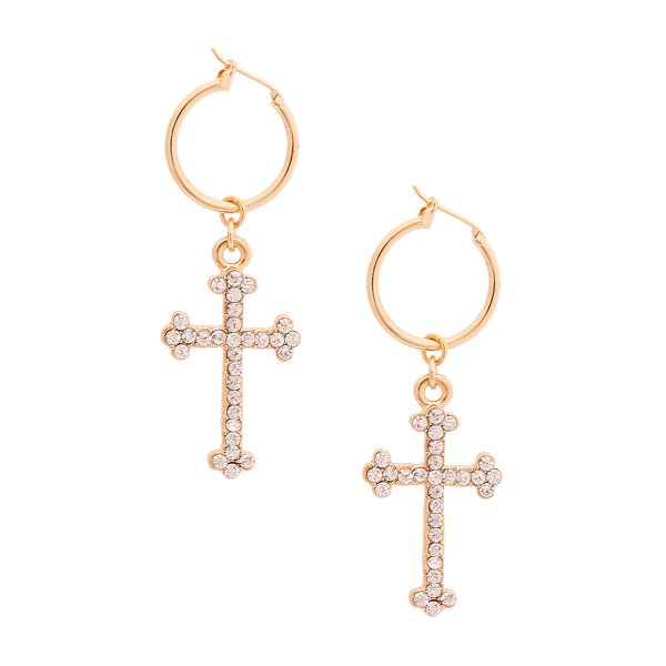 Gold Metal Baby Hoops Earrings Featuring Clear Pave Rhinestone Cross Detail. Cross measures 1.25 inches long