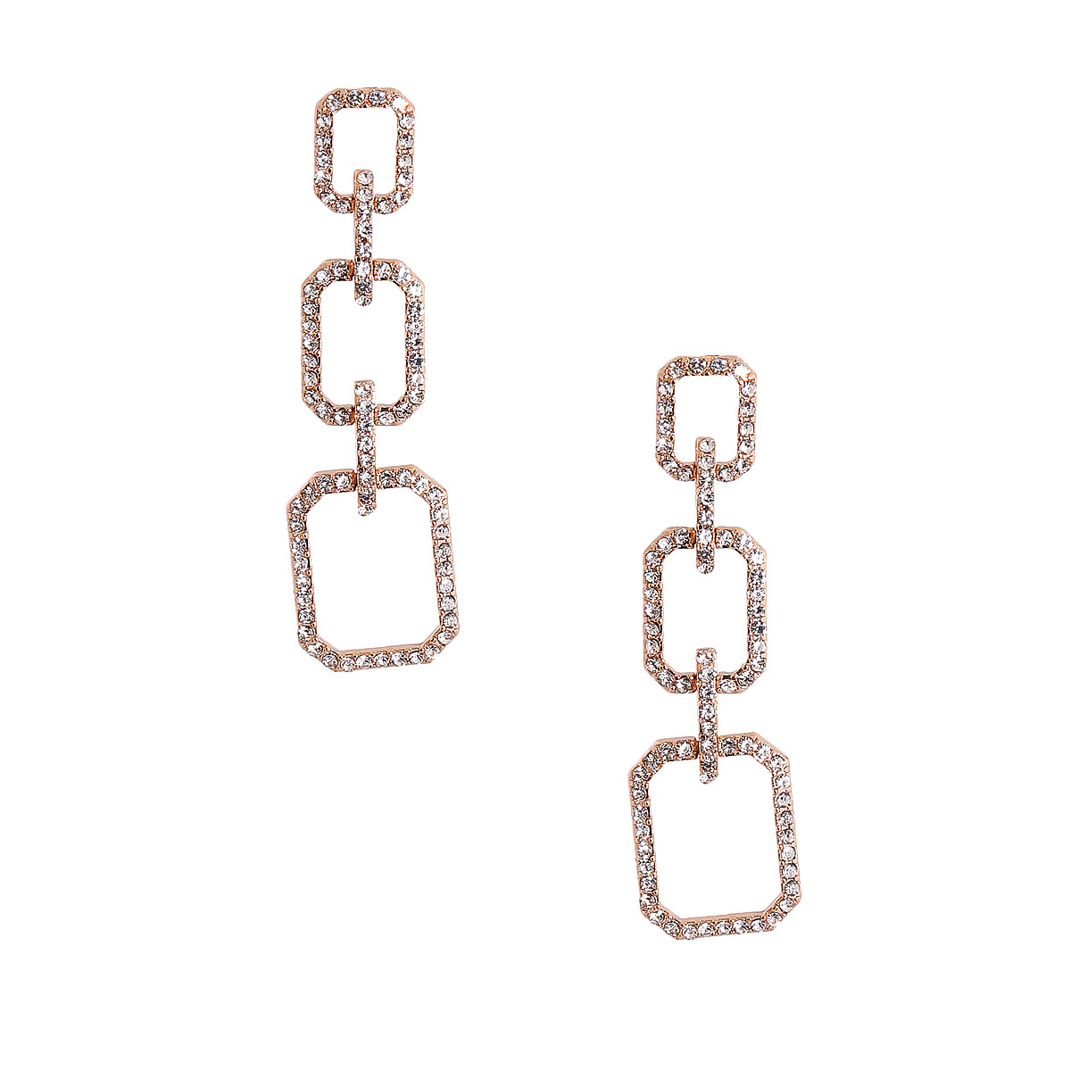 Gold Metal Graduated Rectangle Link Earrings Featuring Pave Rhinestone Detailing. Earrings measure .75 inches wide