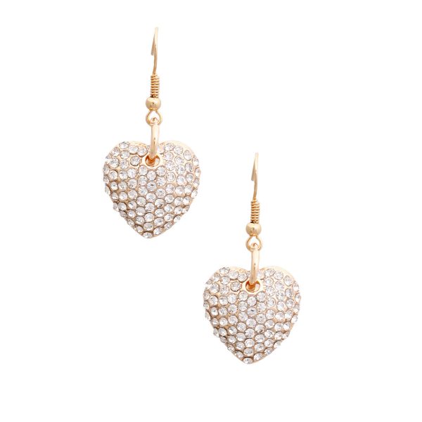 Gold Metal Fish Hook Drop Earrings Featuring Crystal Rhinestone Heart Charm. Heart measures .85 inches