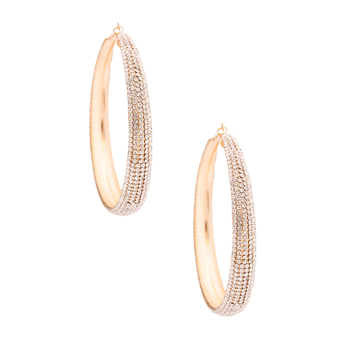 Gold Metal Hoop Earrings Lined with Clear Rhinestone Detailing. Hoops measure .65 inches wide
