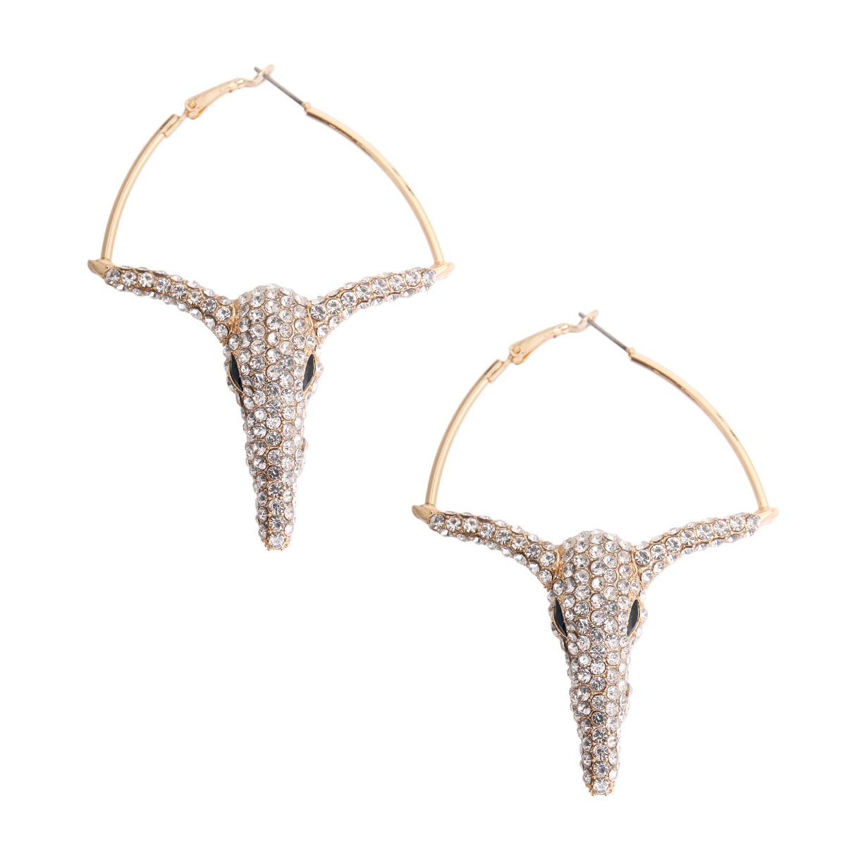 Gold Metal Hoop Earrings Featuring Western Clear Crystal Rhinestone Longhorn Detail. Earrings measure 2.5 inches wide