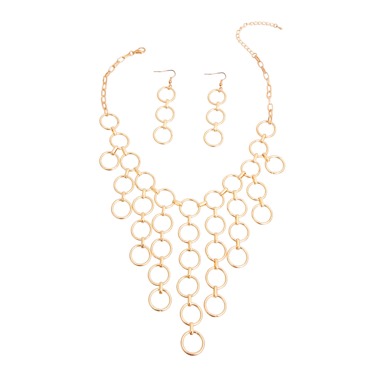 Gold Metal Chain Necklace Set Featuring Linked Ring Drop Detailing. Center Drop measures 5 inches long. Matching earrings measure 2.5 inches long