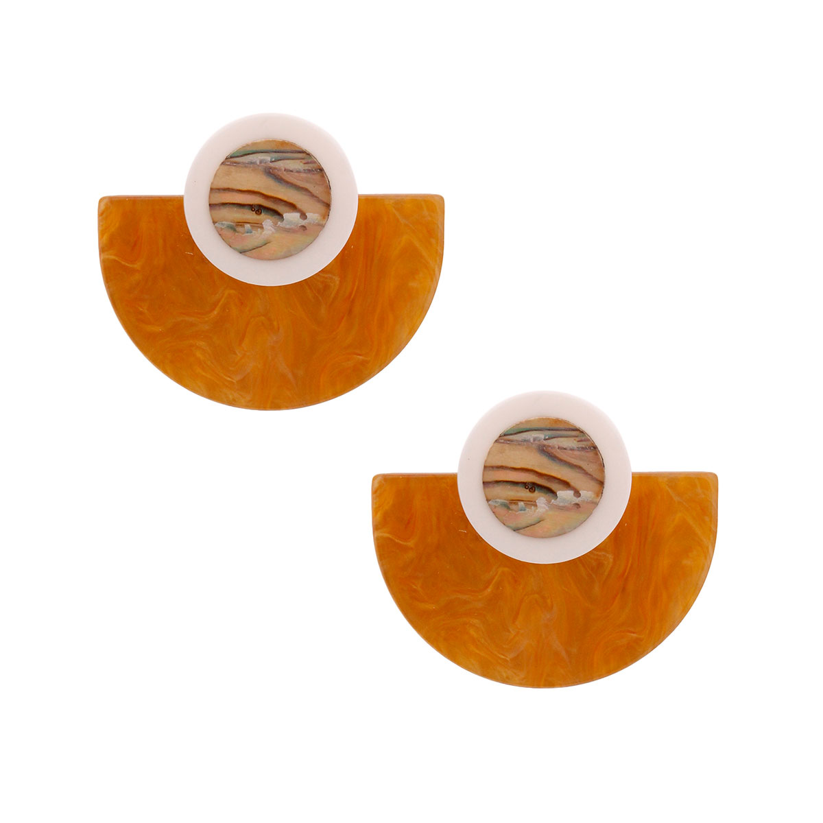 Black and Abalone Earrings Featuring Gold Swirl Acrylic Half Moon Detail. Earrings measure 2.15 inches wide