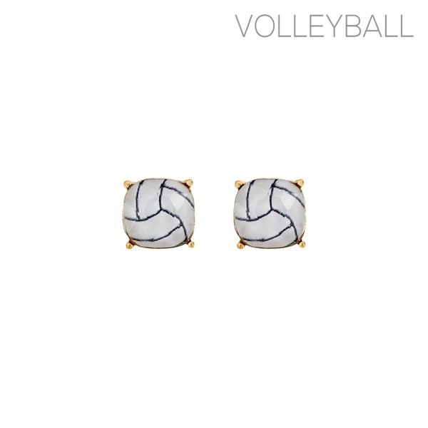 Gold Metal and White Cushion Cut Crystal Vollyball Stud Earrings. Support your favorite sports team.