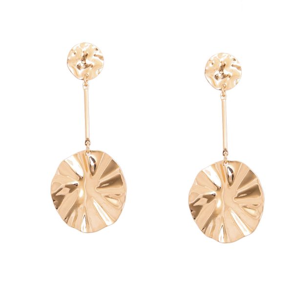 Gold Metal Earrings Featuring Drop Bar and Wavy Metal Circle Detailing. Earrings measure 1.5 inches wide