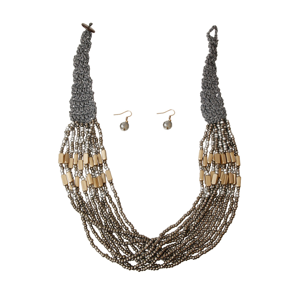 Gray Woven Knit Cord Neckline Toggle Necklace Set Featuring Layered Multi Strands of Gold, Silver, and Gray Beads