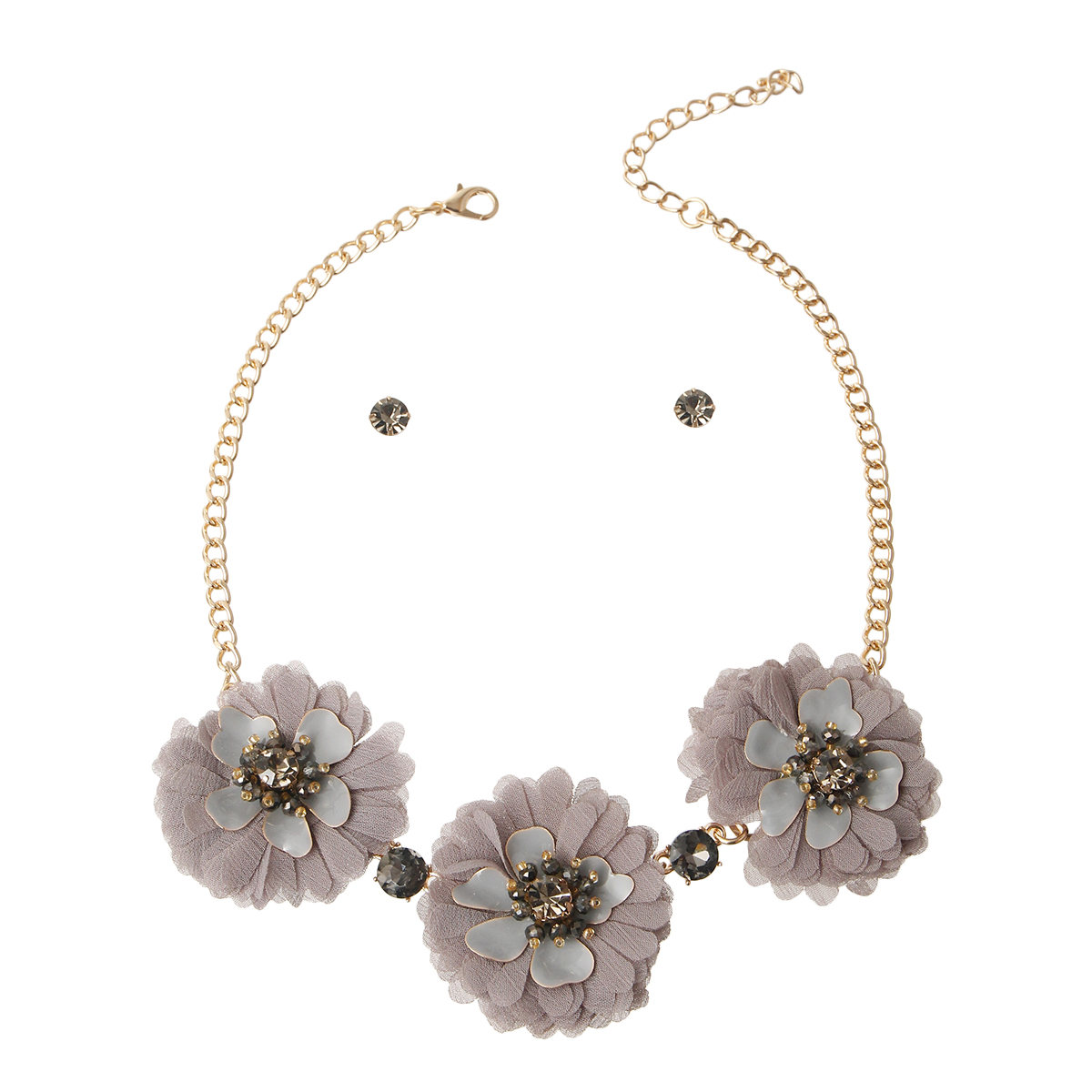 Gold Chain with Gray Fabric Flowers Featuring Metal, Bead, and Rhinestone Details. Flowers measure 2.25 inches
