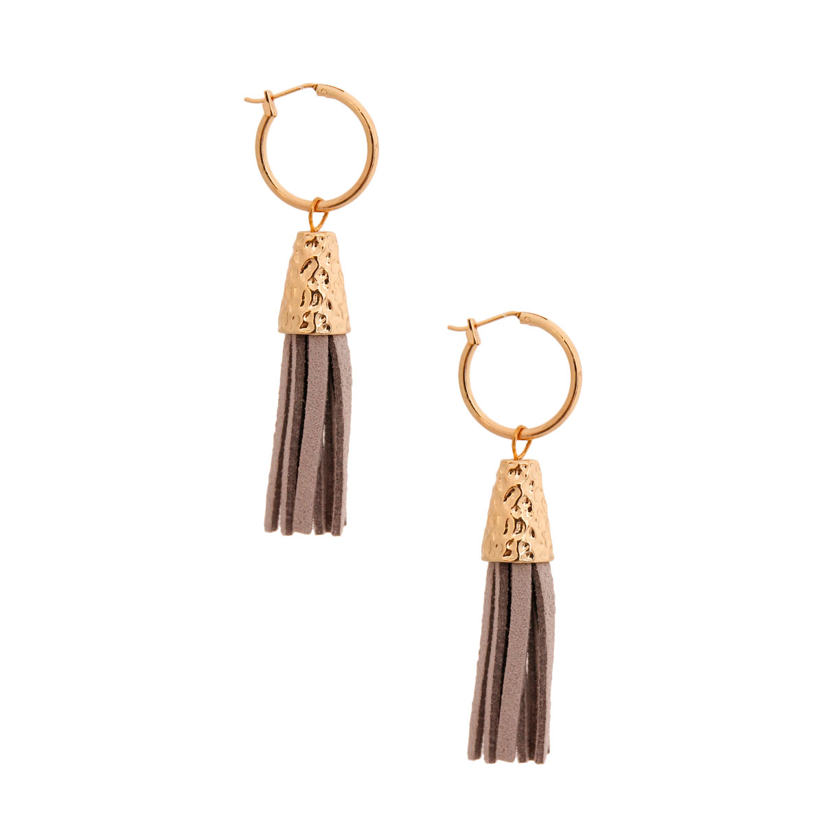 Gold Metal Baby Hoop Earrings Featuring Green Vegan Leather Tassel Drop Detail. Earrings measure .85 inches wide
