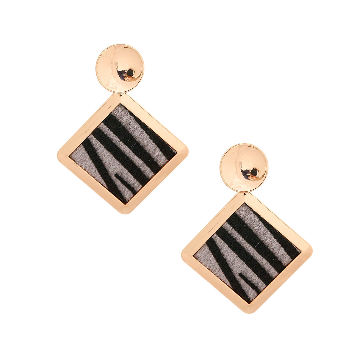Gold Metal Circle Earrings Featuring Diamond Shape Drop Detail with Gray Zebra Vegan Fur. Earrings measure 2.25 inches wide