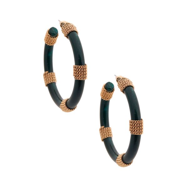 Green Swirled Acyrlic Hoop Earrings Featuring Gold Metal Chain Wrapped Detail. Please allow for color variations