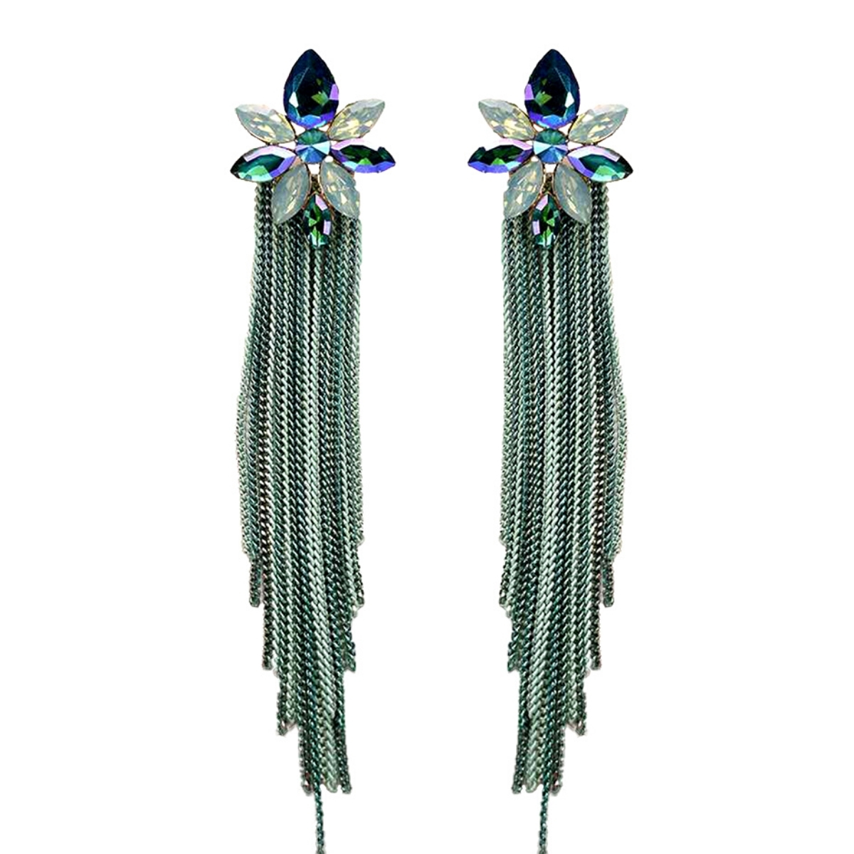 Gold Metal Earrings Featuring Green Crystal Rhinestone Detailing and Long Light and Dark Green Chain Fringe. Earrings measure 1.5 inches wide
