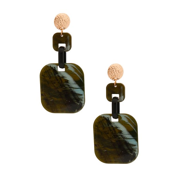 Gold Textured Metal Drop Earrings Featuring Marbled Green Acrylic Square Drop Details. Earrings measure 1.65 inches wide. Please allow for natural color variations