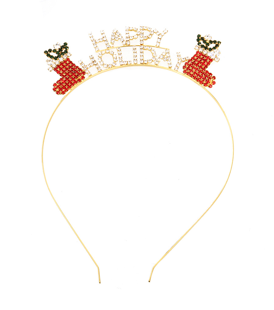 Gold metal hair band featuring Christmas theme holiday statement with clear stones.