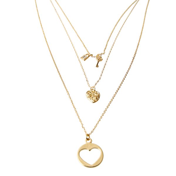 Gold Triple Layered Long Necklace Set Featuring Heart and Love Pendants
