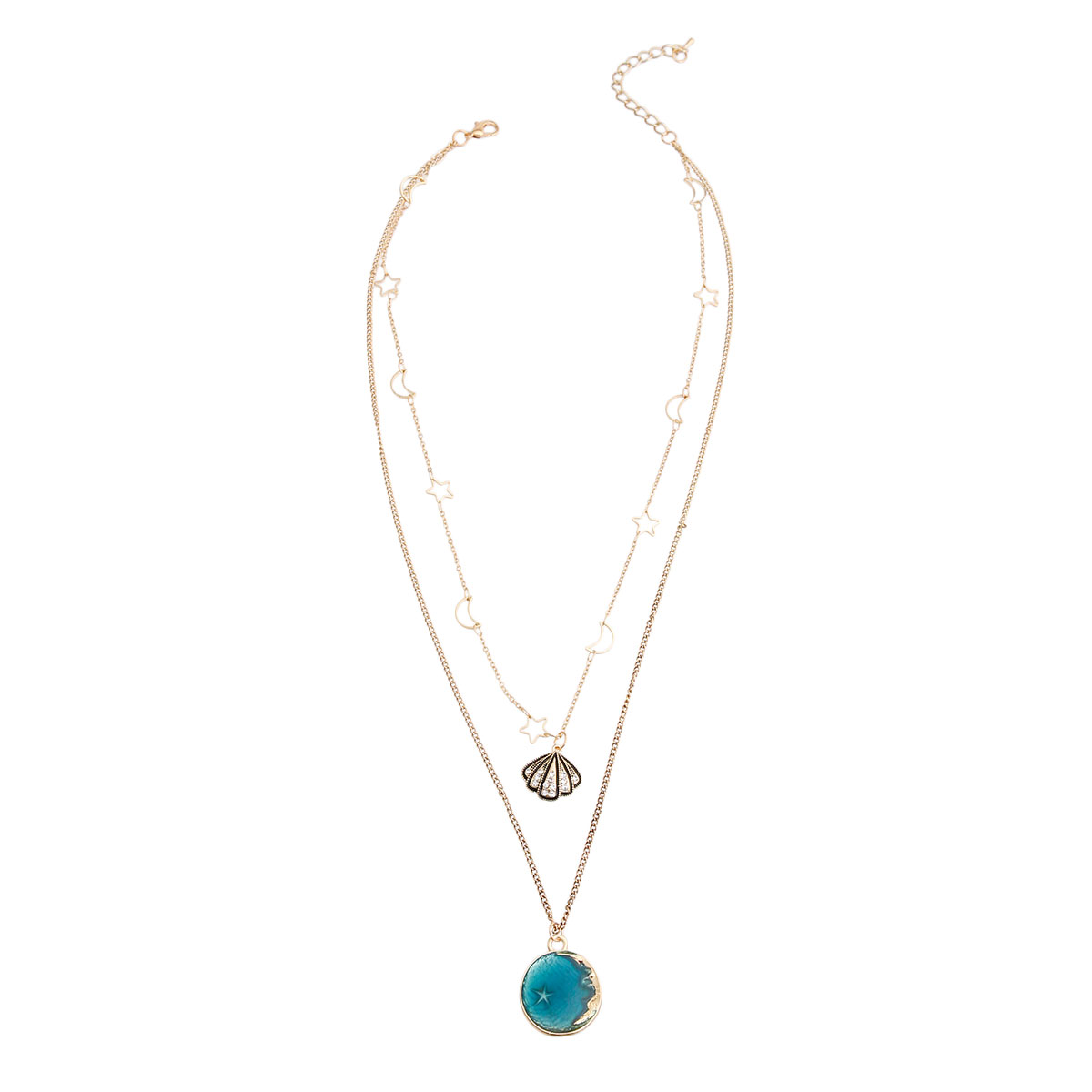 Gold Metal Moon and Stars Layered Necklace Featuring Rhinestone Shell Pendant and Resin Moon Pendant. Moon Pendant measures 1 inch