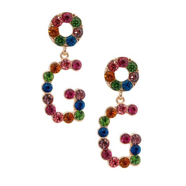 Designer Inspired Gold Metal and Multi Color Crystal Circle Post Earrings Featuring Dangling G Detail. Earrings measure .75 inches wide