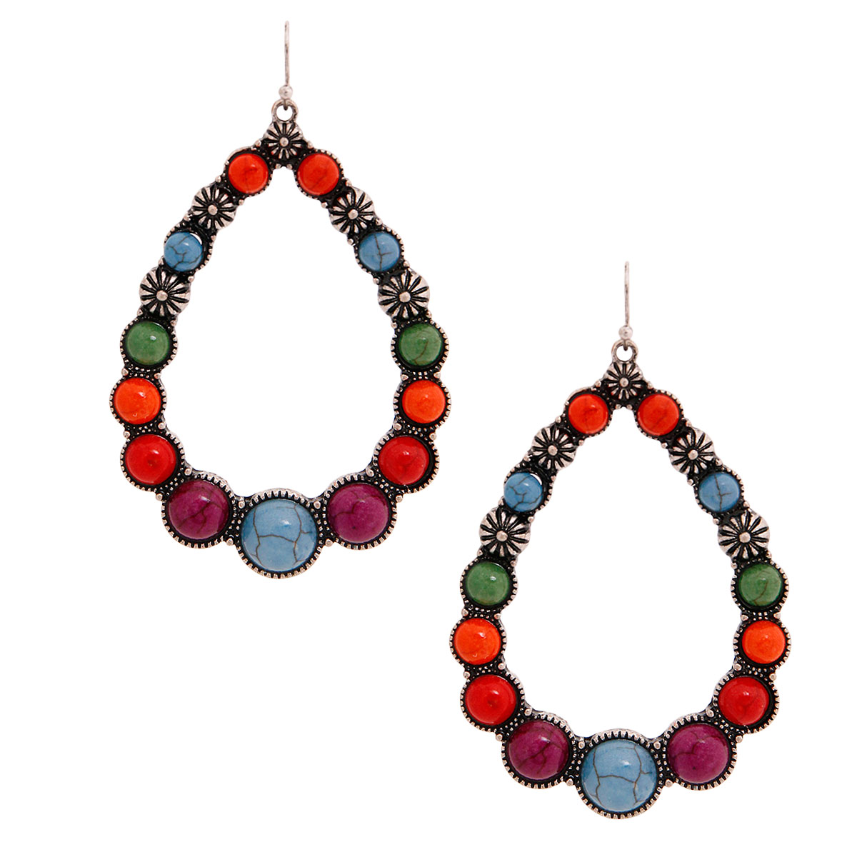 Engraved Burnished Silver Metal and Cracked Multi Color Bead Teardrop Western Drop Earrings. Earrings measure 1.85 inches wide