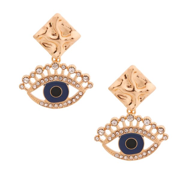 Gold Textured Metal Earrings Featuring Navy Evil Eye with Rhinestone Detailing. Eye measures 1.65 inches wide