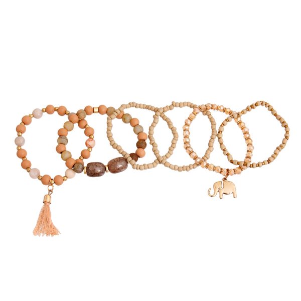 Gold and Neutral Bead 7 Pcs Stretch Bracelet Set Featuring Elephant Charm and Tassel. 7 Pcs Set
