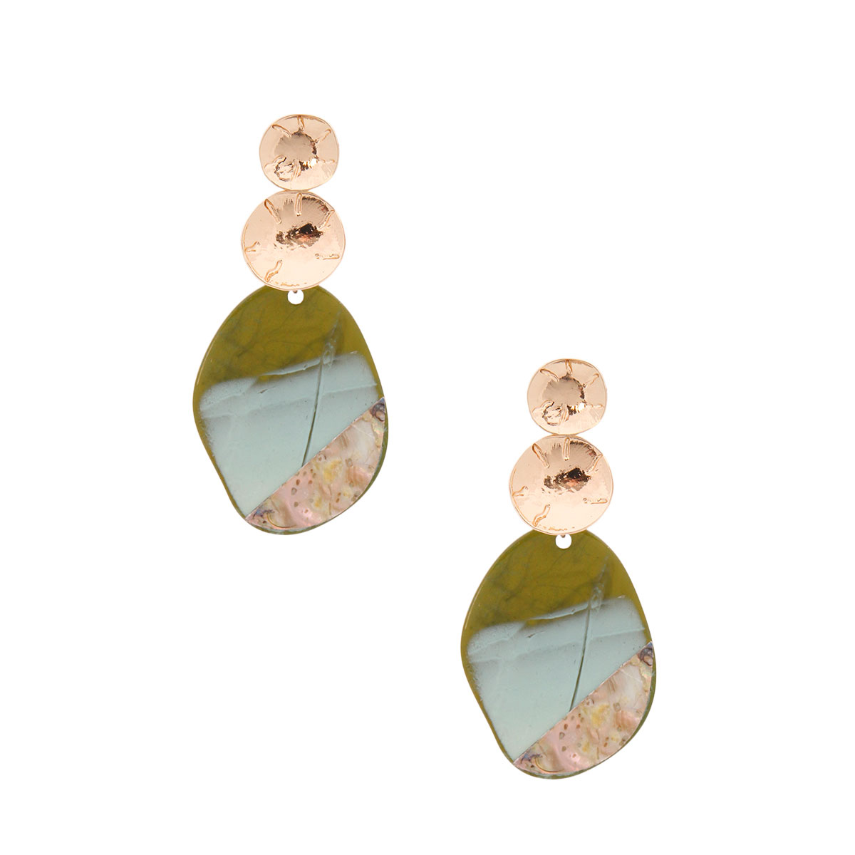 Textured Gold Metal Disc Drop Earrings Featuring Light and Dark Olive Green Acrylic and Abalone Shell Oval Detail. Earrings measure 1.5 inches wide. Allow for Natural Color Variations