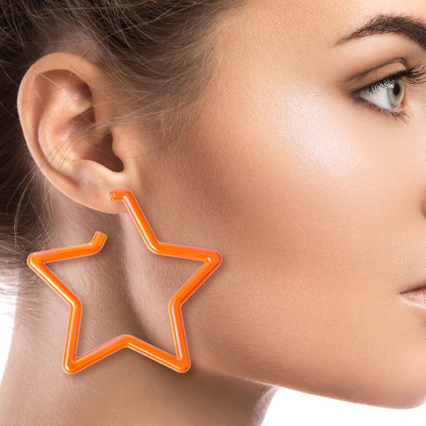 Shiny Orange Star Hoop Earrings. 2.75 inches wide