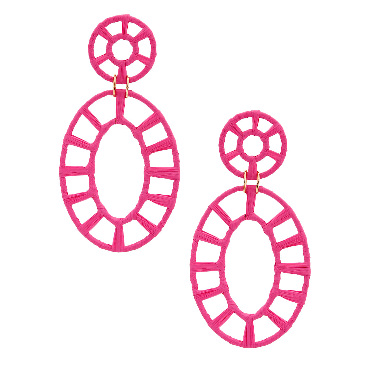 Pink Raffia Wrapped Oval Drop Earrings. Earrings measure 1.75 inches wide