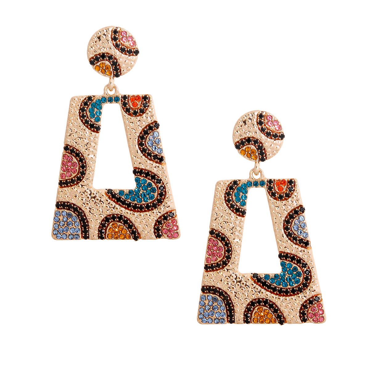 Gold Textured Metal Trapezoid Drop Earrings Featuring Multi Color Rhinestone Polka Dot Detailing. Earrings measure 1.45 inches wide