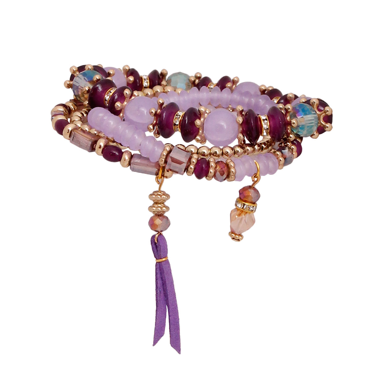 Gold and Shades of Purple Glass Beads 4 Pcs Stretch Bracelet Set Featuring Vegan Leather and Bead Drop Detail