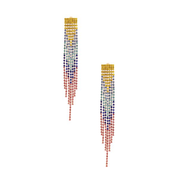 Gold Metal Square Shaped Rainbow Rhinestone Fringe Earrings. Earrings measure .65 inches wide