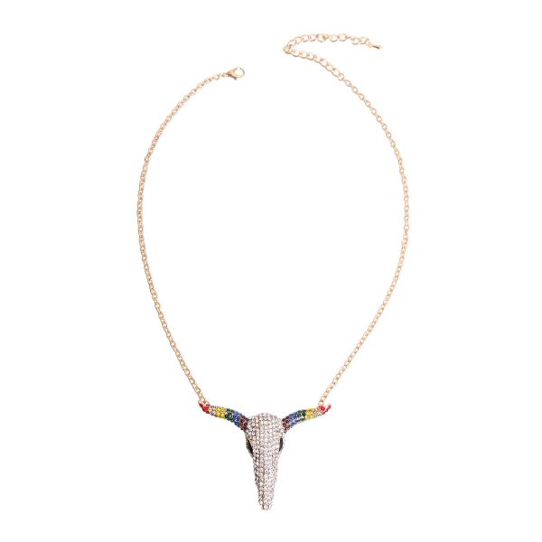 Gold Metal Twist Chain Necklace Featuring Western Rainbow Rhinestone Longhorn Head Pendant. Pendant measures 1.75 inches long