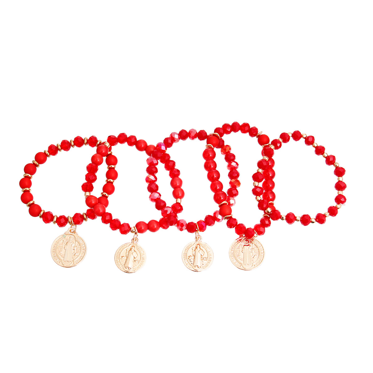 Red and Gold Glass Bead Stretch Bracelet Set Featuring Gold Religious Coin Charms. 5 Pcs Set